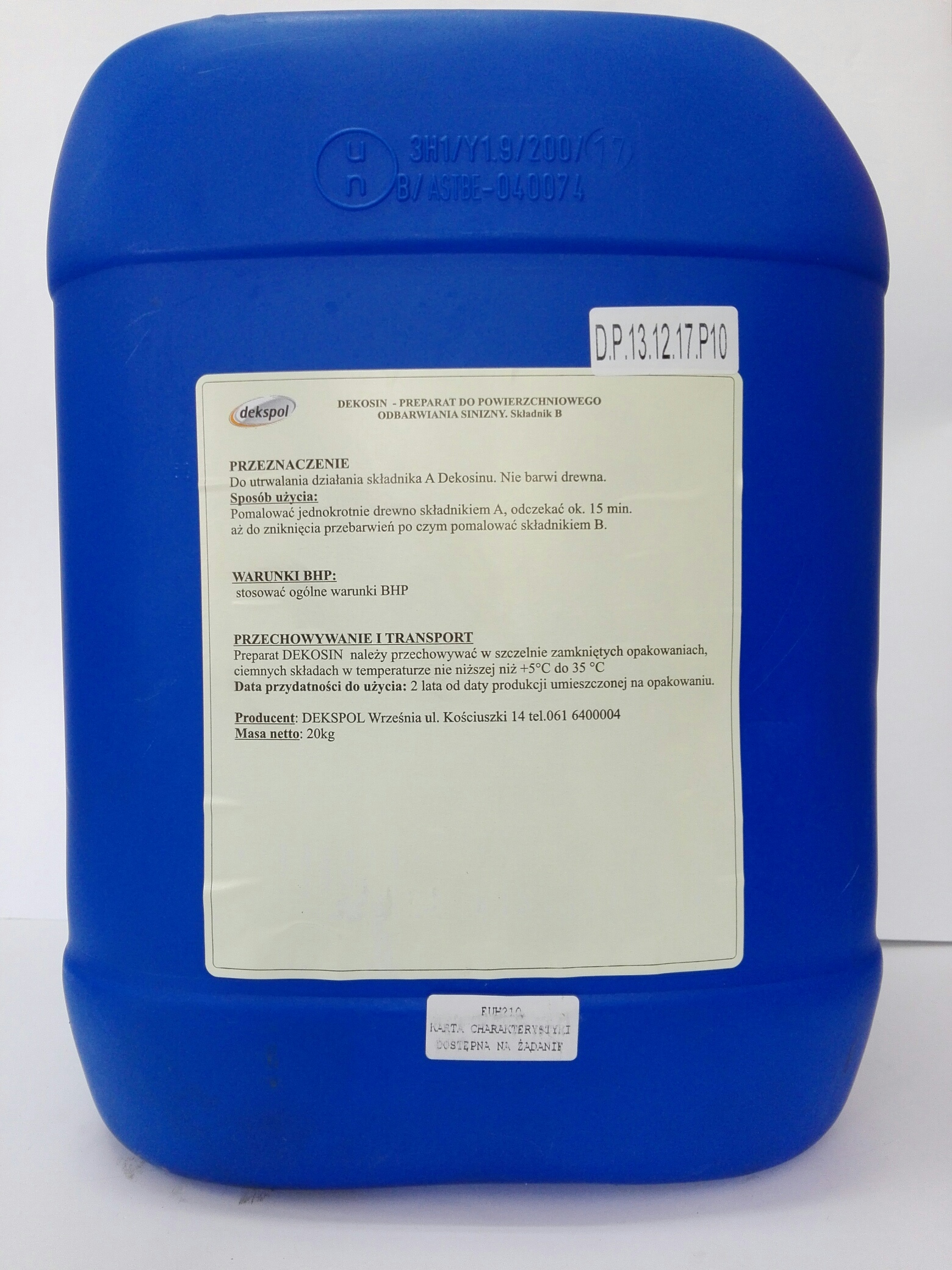 Drewno przeznaczone do malowania powinno być oczyszczone i suche. Stosować produkt handlowy. Pomalować jednokrotnie drewno składnikiem A, odczekać 15 minut aż do zniknięcia przebarwień,po czym pomalować składnikiem B. Można stosować natrysk. W przypadku drewna przeznaczonego do dalszej obróbki mechanicznej, należy zwrócić uwagę na przebarwienia wgłębne, gdyz Dekosin A usuwa przebarwienia sinizny na głębokość ok. 1 mm powierzchni drewna. DEKOSIN likwiduje tylko przebarwienia sinizny, choć ta nie powoduje korozji biologicznej drewna to jednak wpływa na jego wartość handlową. Dekosin B środek ten utrwala działanie środka A.